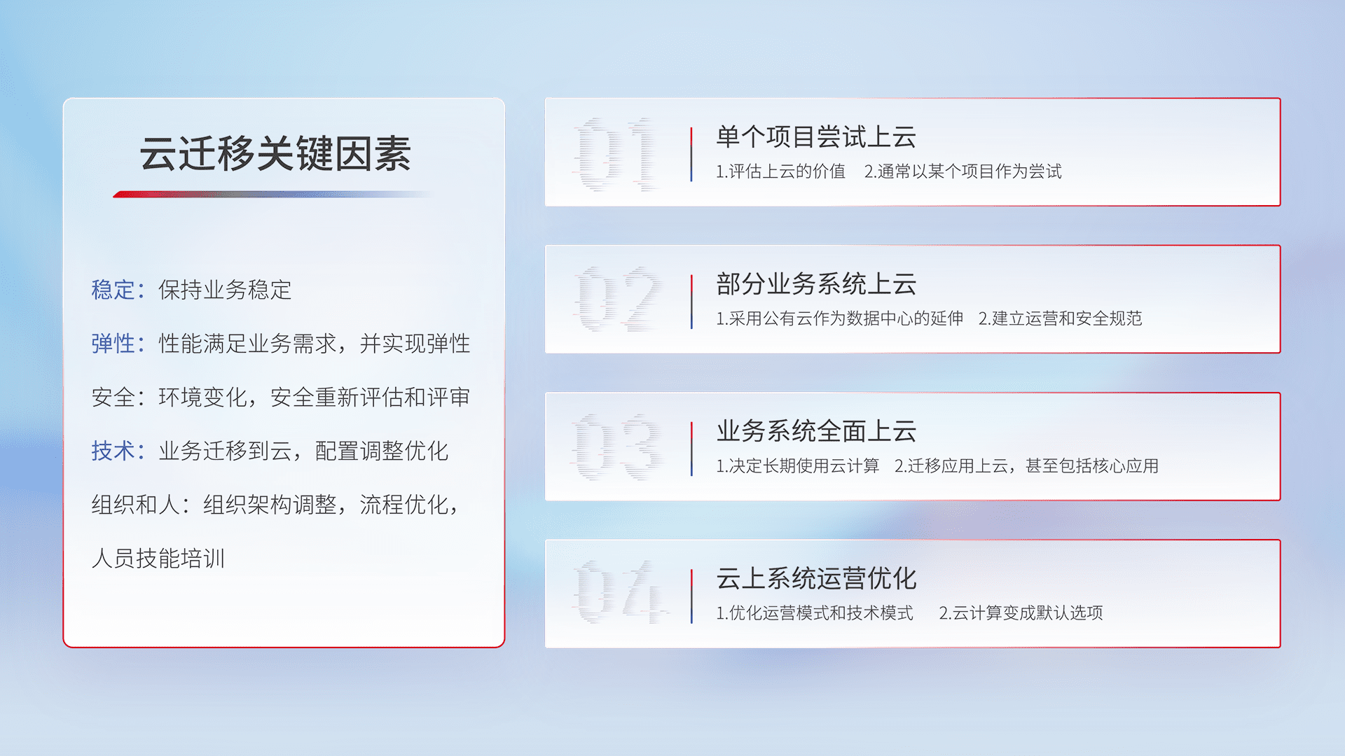 结合实际业务,,,,从规划设计、、云平台选型、、、云原生改造、、、数据迁移、、、集成交付,,,,迁移全过程为客户识别最佳上云路径,,做好风险识别管理,,设计网络架构、、、身份权限、、、、安全审计合规、、操作审计、、、日志审计、、、监控告警策略、、、多站点容灾设计等,,,对云上基础设施进行整体规划,,,,提升IT治理水平,,,,以满足弹性、、、、高可用、、、高性能的需求。。。