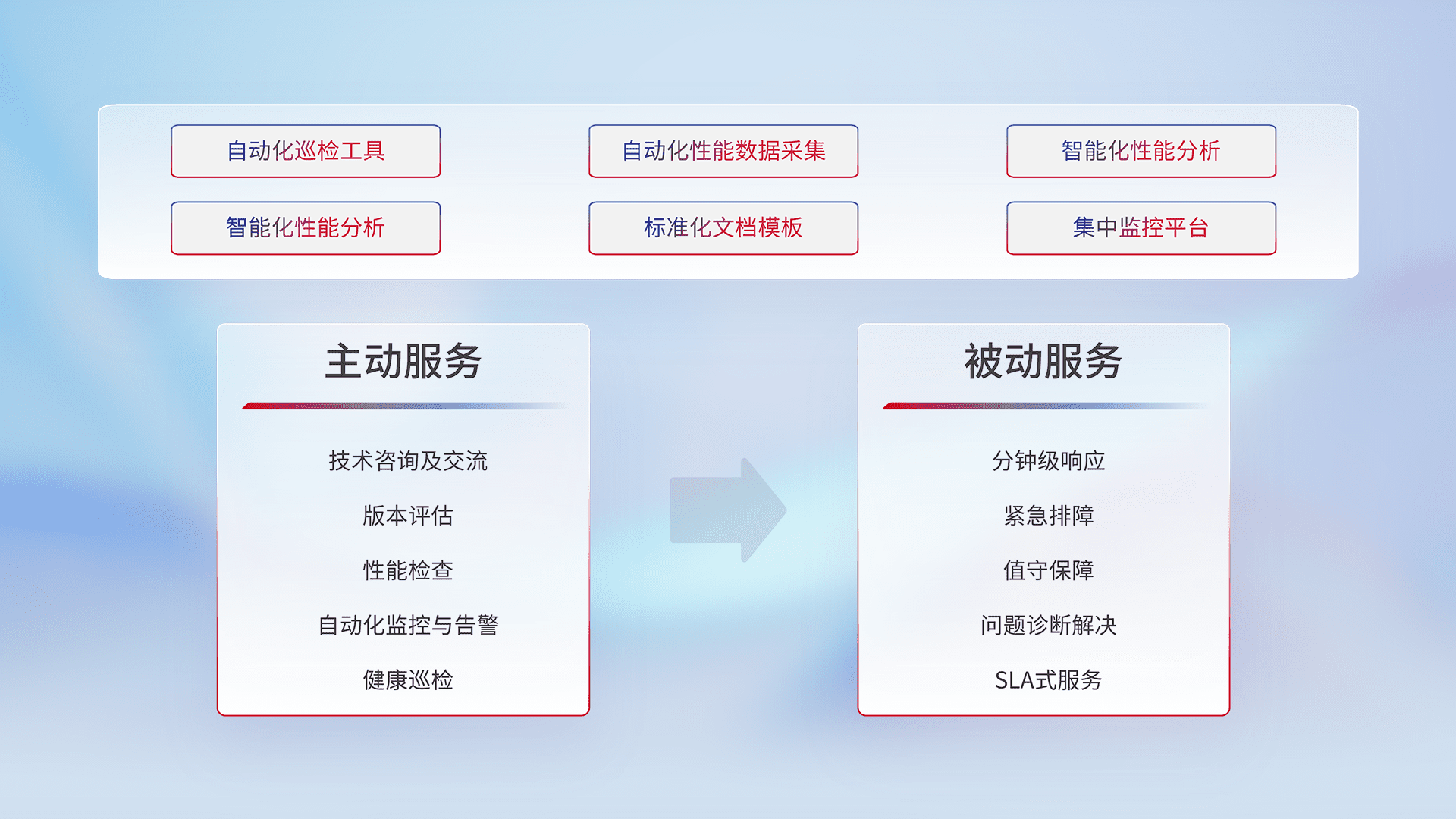 智能化工具和标准化文档,,,,保障服务质量,,,提供主动服务(包含技术咨询、、、版本评估、、、、性能检查、、自动化监控与告警、、、、健康巡检)和被动服务包含(分钟级响应、、、、紧急排障、、、值守保障、、问题诊断解决、、、、SLA服务)。。